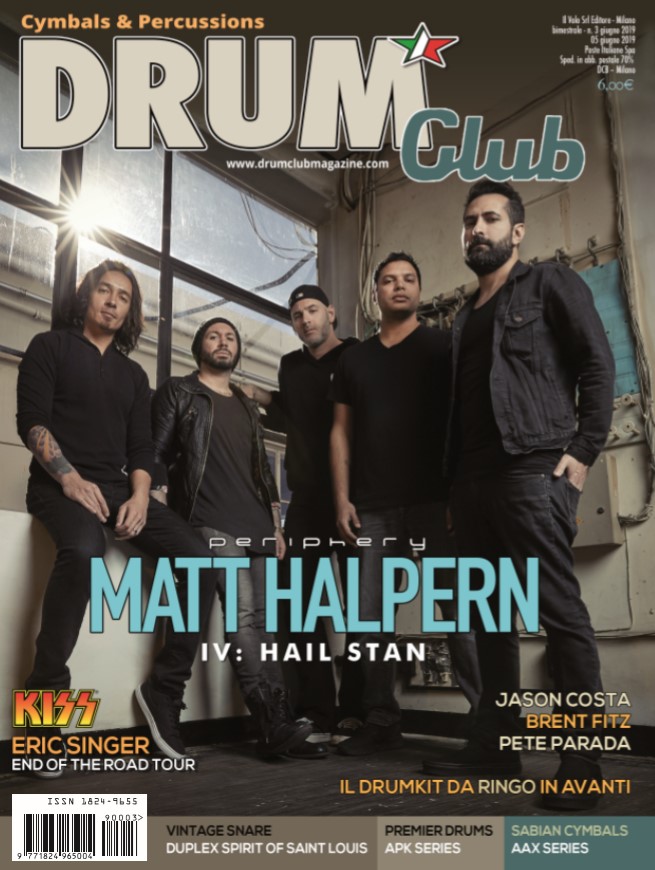 Il nuovo numero di Drum Club suona potente e affilato, con Matt Halpern a capeggiare sulla nostra copertina insieme ai suoi Periphery, da poco tornati con il nuovo "IV: Hail Stan". A fare compagnia ad Halpern trovate anche Eric Singer dei Kiss, pronto a parlarci dell'ultimo tour con la band prima del ritiro definitivo, Pete Parada (Offspring), Jason Costa (All That Remains), Federico Paulovich dei Destrage, e Fabio Moresco del Banco del Mutuo Soccorso. Oltre alla consueta sezione didattica troverete anche i test della APK Series di casa Premier, e della AAX Series di Sabian, così come uno speciale dedicato al vintage (Duplex Spirit of Saint Louis).