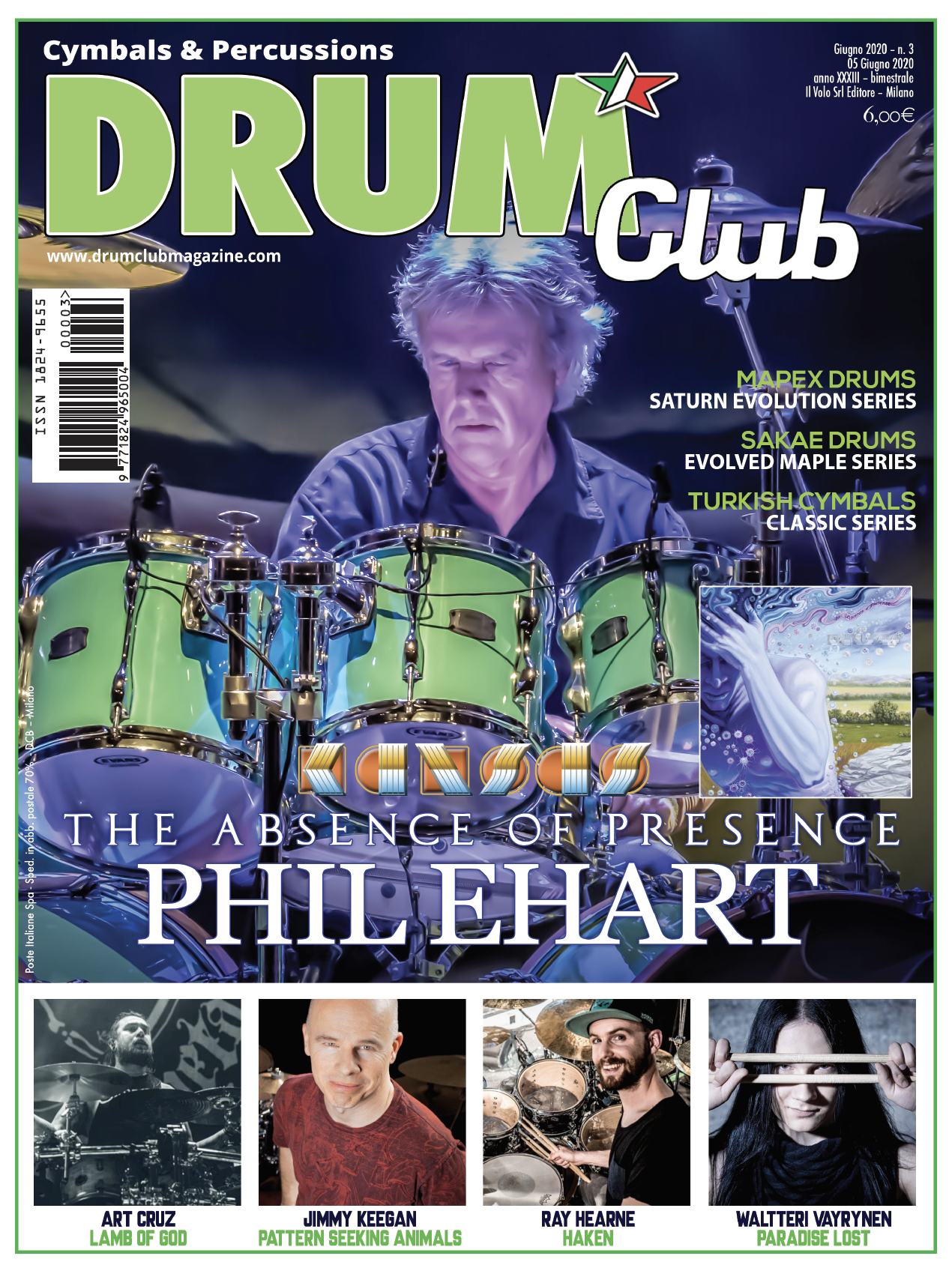 A giugno Drum Club torna in edicola con un nuovo numero ricco di contenuti. Phil Ehart batterista del Kansas fin dal 1973 è in primo piano sulla nostra copertina grazie al ritorno della sua band con il nuovo "The Absence of Presence" (Inside Out Music). Non abbiamo perso l'occasione di avere Ehart fra le pagine della rivista con un'intervista che ha spaziato fra le avventure di una carriera lunga e di grande successo.