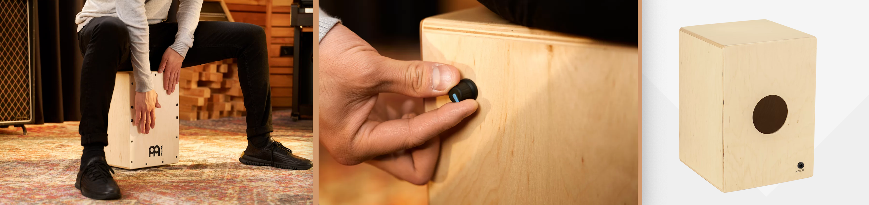 Basse ricche di punch percuotendo il frontale nell’area più centrale, e taglienti suoni da rullante percuotendo il cajon vicino agli angoli. Il pickup piezo con relativo controllo del volume e l’uscita a jack da ¼” consentono di dare boost al suono con ogni tipo di amplificatore o P.A System.