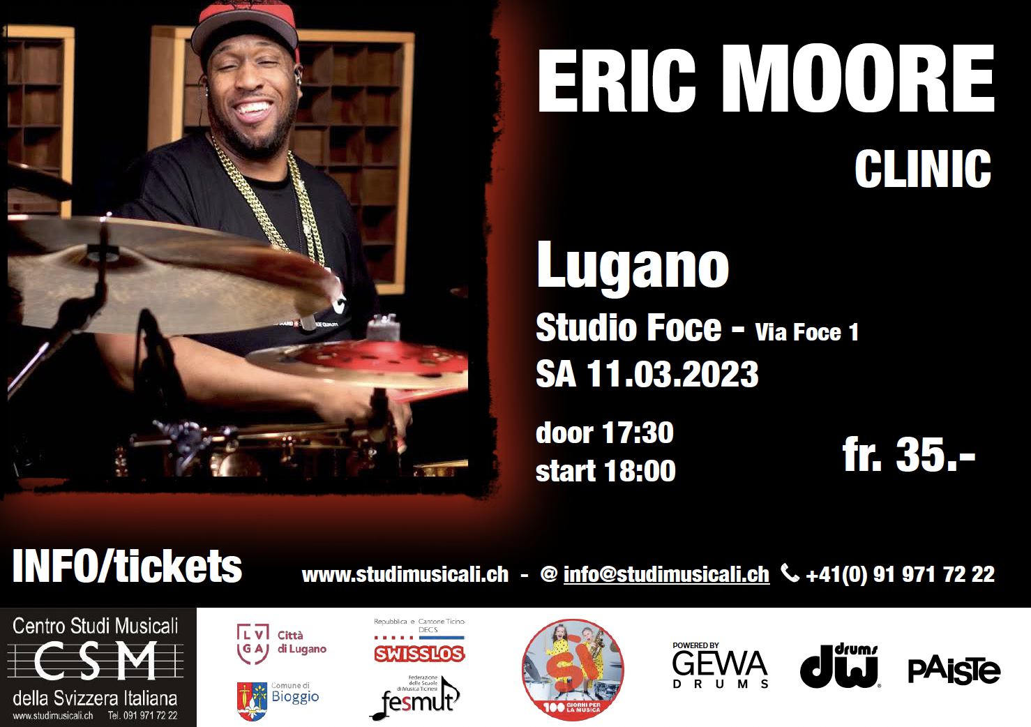 Sabato 11 marzo 2023, clinic con Eric Moore al Centro Studi Musicali della Svizzera Italiana. Ore 18:00