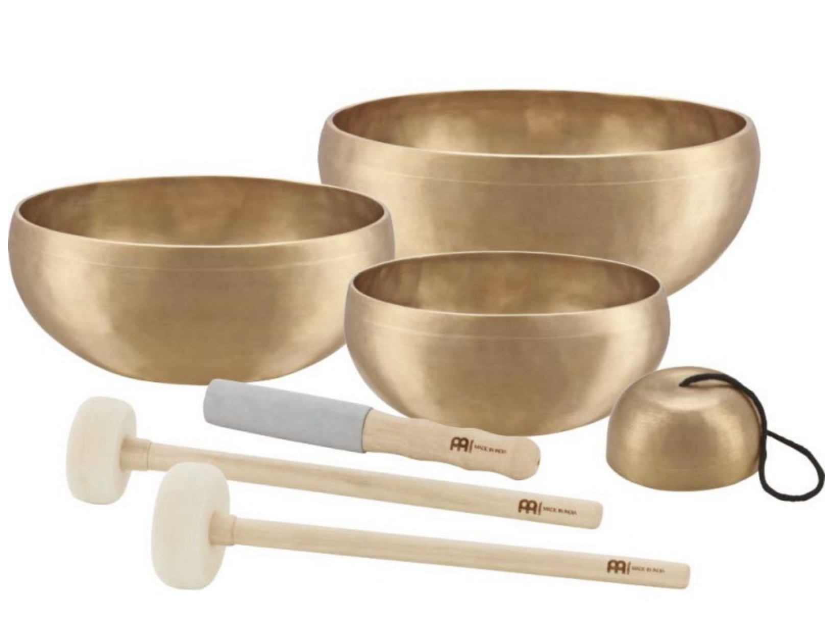 Proposte nelle dimensioni più assortite, le sette campane tibetane della serie Cosmos Therapy firmata Meinl sono realizzate artigianalmente in India con una speciale lega di bronzo; sono utilizzabili singolarmente o combinabili con tonalità diverse per la formazione di peculiari set. Tra i set proposti da Meinl per tale serie vi è quello denominato con la sigla SB-C-4750, comprensivo di quattro campane tibetane con i diametri 2,7” (cm 9,5), 7,6” (cm19,3), 9” (cm 22,9) e 10,3” (cm 26,2), feltro per l’appoggio e custodia. Prezzo: Euro 849,00 Numerosi i battenti proposti dalla serie Cosmos Therapy, impiegabili secondo le esigenze.