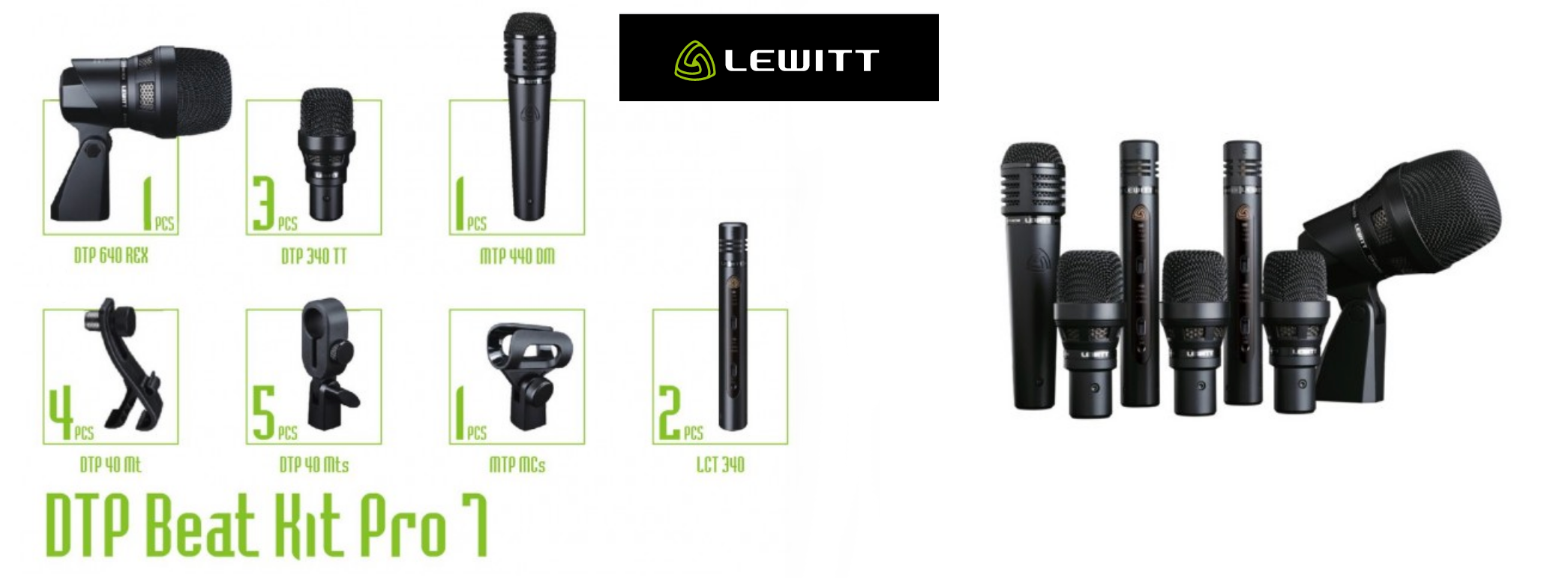 DTP Beat Kit Pro 7 è un set di microfoni che Lewitt, celebre brand austriaco, propone per catturare e restituire in maniera fedele il suono in arrivo dai vari strumenti del drumkit. Sette i microfoni che compongono DTP Beat Kit Pro 7: un DTP-640 Rex, tre DTP340TT, due LCT340 ed un MTP440DM. La dotazione si completa con i relativi sistemi di aggancio (clip) ed accessori: antivento LCT40W, supporti antishock DTP40MT e MTP 40 MC, più cavo 5pin per DTP-640 Rex. Tutto, racchiuso all’interno di una robusta custodia in alluminio dotata di doppia imbottitura al suo interno.