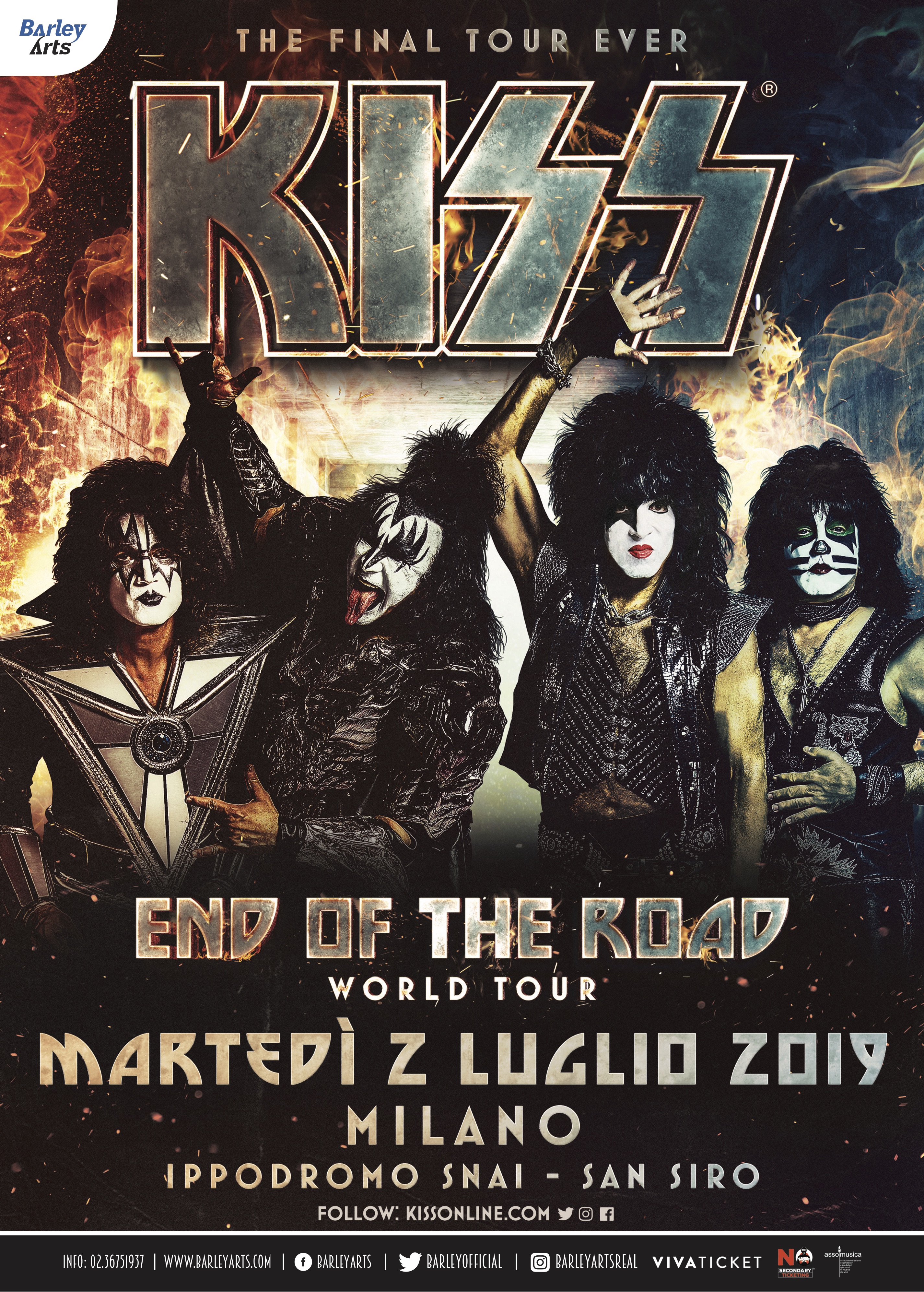 45 anni di straordinaria carriera, 100 milioni di album nel mondo e milioni di fans della Kiss Army… I Kiss, icone assolute del R&R, annunciano che nel 2019 faranno il loro ultimo tour che hanno battezzato End Of The Road. Una sola la data sulla Penisola.