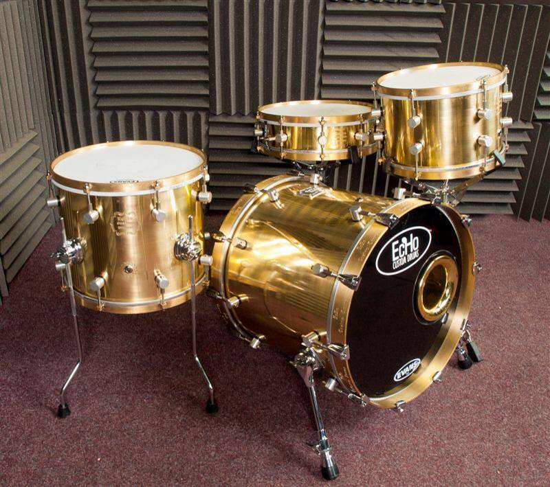 hanno un’estetica troppo piatta. I batteristi vogliono batterie dal suono caldo, calibrato, controllabile ed una finitura che deve riflettere il gusto estetico del musicista o del tema della band di cui è parte. I fusti in metallo sembrano delle pentole (!) non per niente Palmer fece serigrafare con disegni bucolici e scene di caccia i fusti della sua Stainless Steel Custom Made... Tuttavia, per quanto riguarda l’estetica, EcHo ha aggirato l’ostacolo producendo fusti in alluminio, ottone, acciaio e rame. In particolare, l’estetica del rame è affascinante: fusti lucidati a mano e laccati per preservare la lucentezza negli anni. Tuttavia EcHo rende disponibili anche i fusti privi laccatura, dedicati al batterista che ama il color turchese del verderame che va a formarsi nel corso del tempo.