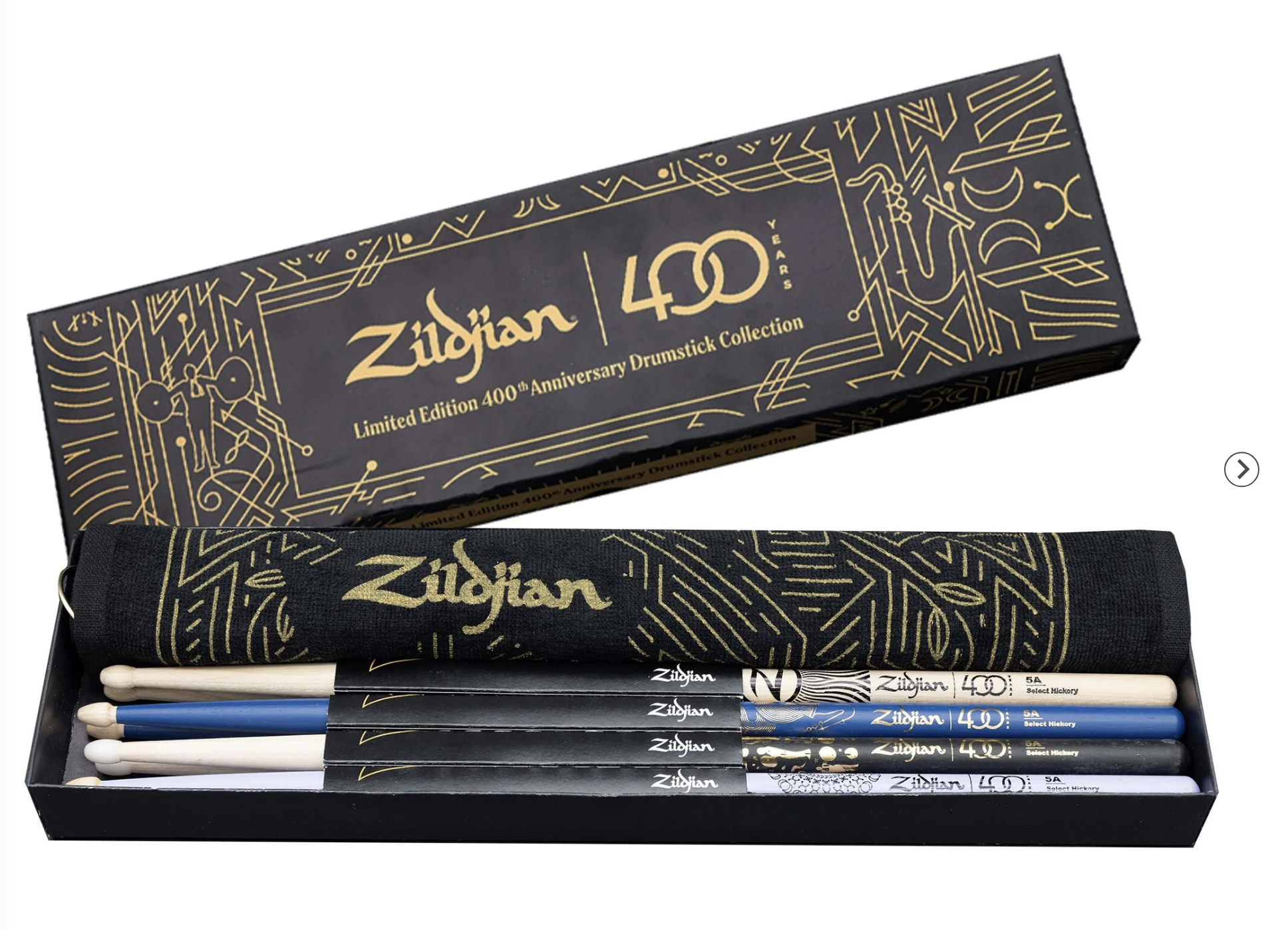 Zildjian official websiteZildjian 400th Anniversary Drumstick Bundle – Limited EditionQuattro paia di bacchette 5A Selected Hickory con fogge differenti a celebrare quattro capitoli della storia del marchio, più un piccolo asciugamano nero, decorato e completo del logo Zildjian.