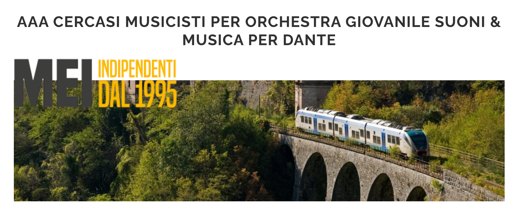 Tutti coloro che si sono occupati della biografia di Dante, cominciando dal Boccaccio, hanno evidenziato il grande amore per la musica di Dante. Anche nella sua opera più importante, la Divina Commedia, egli mostra questa sua passione facendo uso di simboli e metafore musicali. Per questo motivo il MEI in occasione dei 700 anni dalla morte di Dante per il prossimo "Treno di Dante" del 25 marzo 2021 vuole realizzare una orchestra di giovani musicisti under 35 che si renda disponibile a realizzare una piece musicale che omaggi Dante durante le principali fermate del Treno di Dante ( con tappe a Ravenna, Faenza, Marradi, Firenze e altre eventuali) per quella giornata. L’omaggio rielaborerà progetti e brani musicali già realizzati in omaggio a Dante e alle sue opere oltre ad altri eventuali opere e brani inediti venissero proposti sempre inerenti al tema. A tale proposito si prega inviare la propria candidatura alla email: mei@materialimusicali.it (indicando come causale “Suoni & Musica per Dante”) entro e non oltre il 31 gennaio 2021 indicando: nome, cognome, residenza completa, dati anagrafici completi, contatti cellulare e mail e altri contatti social, se cantante oppure strumento/i