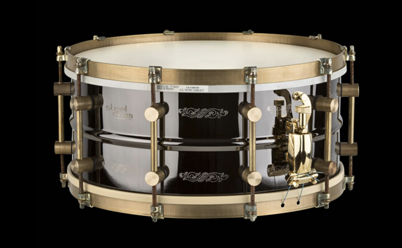 www.steeldrum.it2018 Limited Edition Realizzato in soli 10 esemplari, questo rullante sfodera un fusto in ottone nichelato nero e decorato con incisioni al laser. Tiranti in ottone grezzo, cerchi in ottone grezzo (mm 2 con clips) e cordiera Puresound (20 fili). Aquarian Vintage Heads. Dimensioni proposte: cm 14x5” e 14x6,5”
