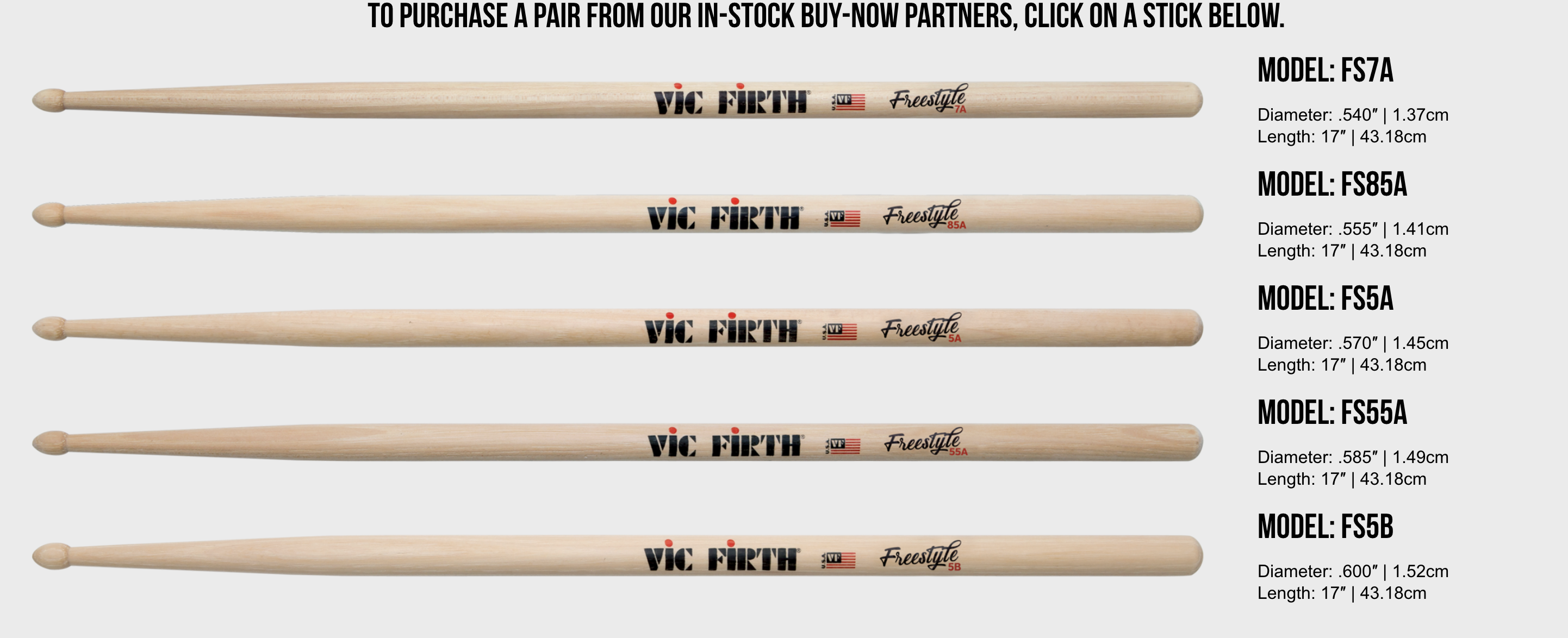 Sono cinque i modelli di bacchette che costituiscono la gettonata American Concept Freestyle Series a marchio Vic Firth: FS7A, FS85A, FS5A, FS55A e FS5B. Tutte in hickory, di tipo long taper e medesima lunghezza extra. Varia la finitura della superficie e, naturalmente, il diametro.