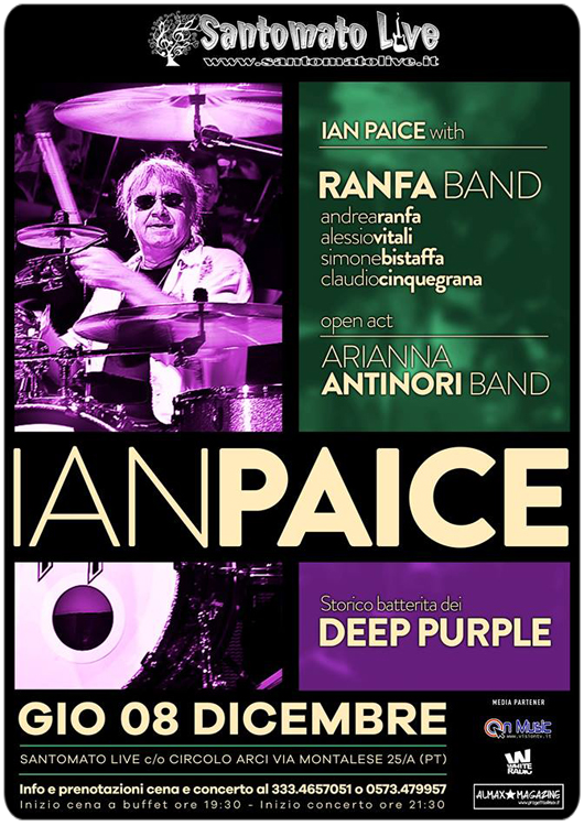 Giovedì 8 dicembre 2016 Ian Paice, lo storico batterista dei Deep Purple, porterà sul palco del Santomato Live di Pistoia i brani più noti della pluridecorata band britannica, accompagnato dalla Ranfa Band.