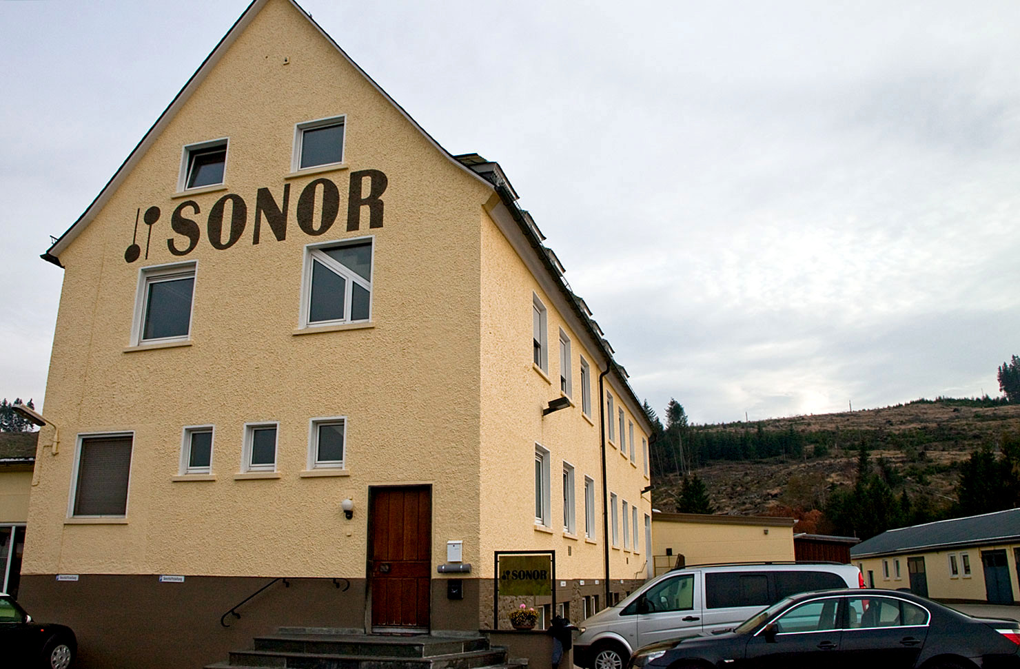 Sorprende trovare questo importantissimo stabilimento proprio qui, in questo minuscolo paesino. Casette che sembrano quelle di marzapane di Hansel e Gretel, con profusioni di fiori e di piantine grasse a far capolino tra le tendine di pizzo, dietro i doppi vetri delle finestre. Lindi marciapiedi dove ci si aspetta che qualche robusta matrona del luogo ci inviti ad usare un paio di pattine per non rovinarli. Non una macchina parcheggiata fuori posto, non un rumore molesto, non una carta di caramella abbandonata per terra al suo destino. In questo ambiente lungo la valle dell'Eden, un limpido rigagnolo dove alcuni pesci giocano a rincorrersi, attraversato un ponticello appare lo stabilimento della Sonor, con imponenti boschi di pini a far da cornice.