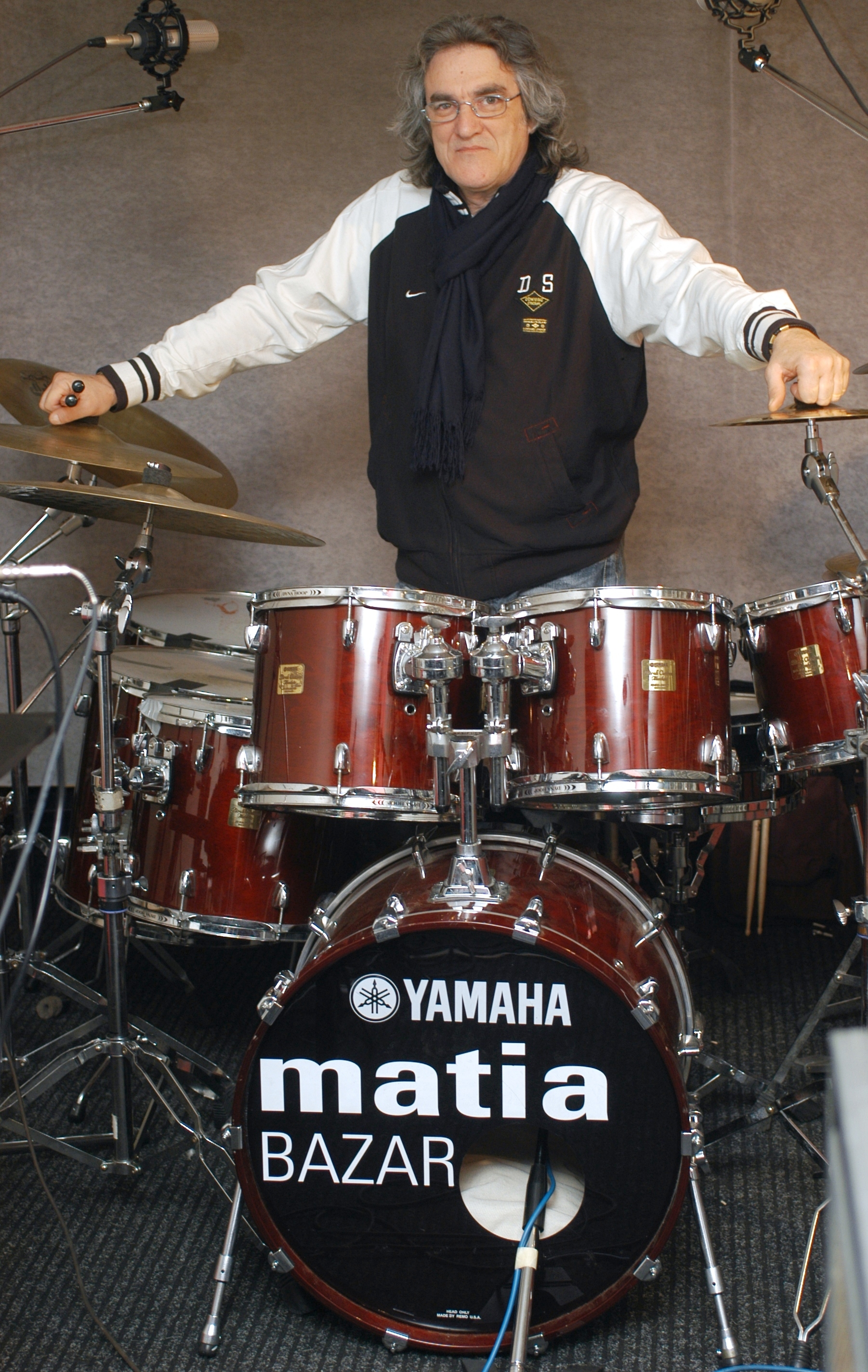 Qual è stata la prima batteria usata con i Matia Bazar? La Ludwig che avevo portato in dote, poi venduta per acquistare strumenti più importanti: in pratica sacrificata sull’altare dei Matia Bazar. Si trattava di una Ludwig d’annata che oggi pagherei per avere ancora. Passai poi ad una Meazzi, marchio che mi offrì, anche grazie al successo del primo singolo, una sponsorizzazione andando per una volta contro l’egemonia giapponese. Una bellissima batteria tutta montata su tralicci, diventati di moda dieci anni più tardi. La cassa era montata su binari di modo che potesse scorrere orizzontalmente e sopra, al posto del perno che sosteneva i due coni, erano piazzati due perni che reggevano due binari orizzontali dai quali si diramavano i bracci dei tom: in pratica entravi in scena con un movimento orizzontale. Ti portavi i charleston e il seggiolino ed eri a posto. Purtroppo stampi e materiali erano quelli che erano, non competitivi con i giapponesi. L’ho tenuta per circa tre anni. Non scordiamoci poi che fu la Meazzi a inventare il "perno a sfera", idea poi sviluppata dalla Yamaha nel classico "snodo". Un’altra trovata fu il "timpano a pedale". Sulla pelle inferiore erano collegate delle stecche, lamine le quali, pigiando sul pedale posizionato sotto, tiravano o rilasciavano la pelle a mo’ di suono sinfonico. Non ne ho cambiate molte nel corso della mia carriera, oggi suono una Yamaha, semplice ma assolutamente funzionale.